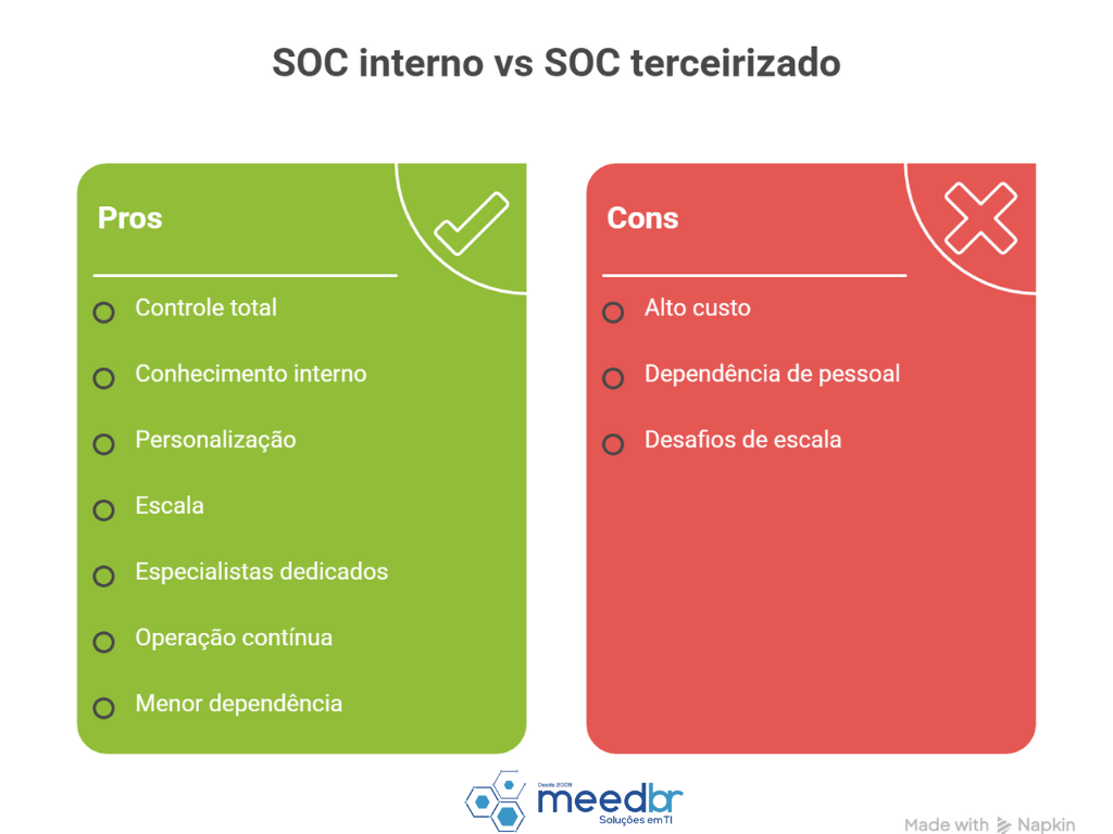 Quando operado com contratos claros, governança, segregação de acesso e boas práticas, o SOC terceirizado é considerado seguro e eficiente.