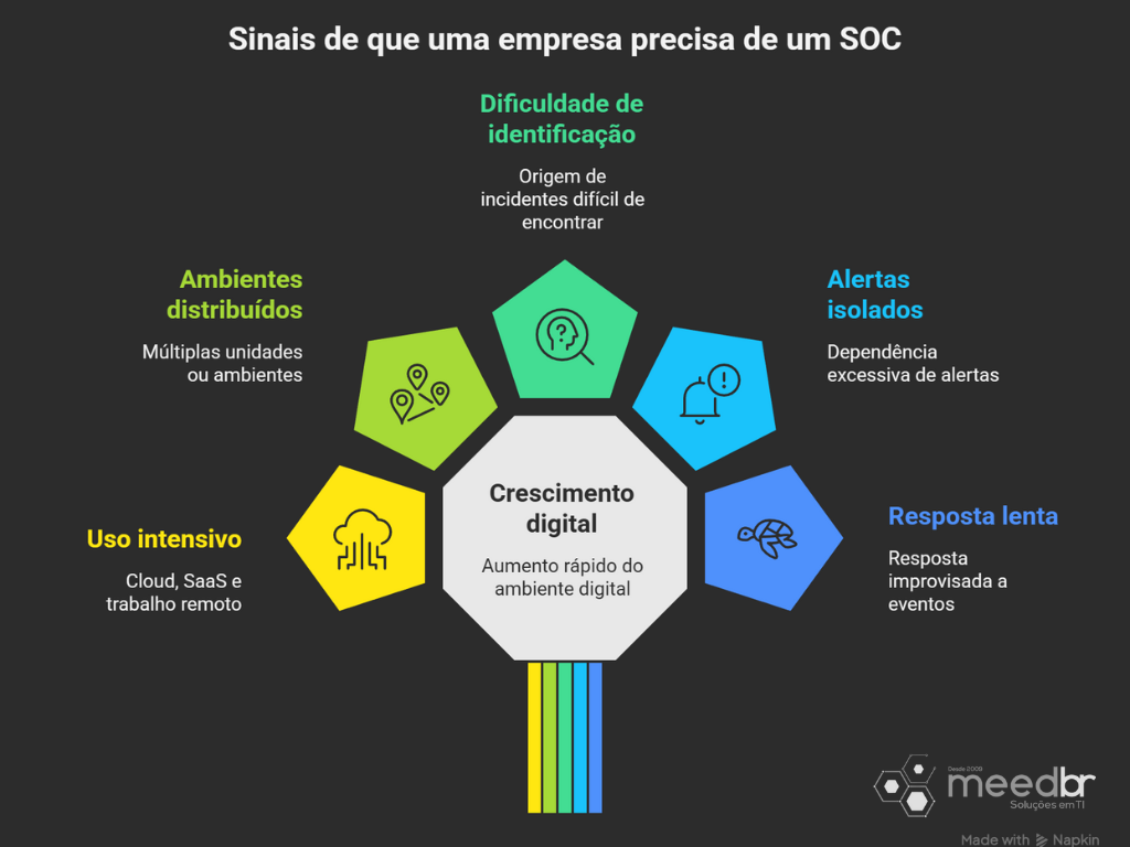 O SOC passa a ser necessário quando há crescimento do ambiente, uso intensivo de cloud, baixa visibilidade de segurança ou exigências regulatórias.